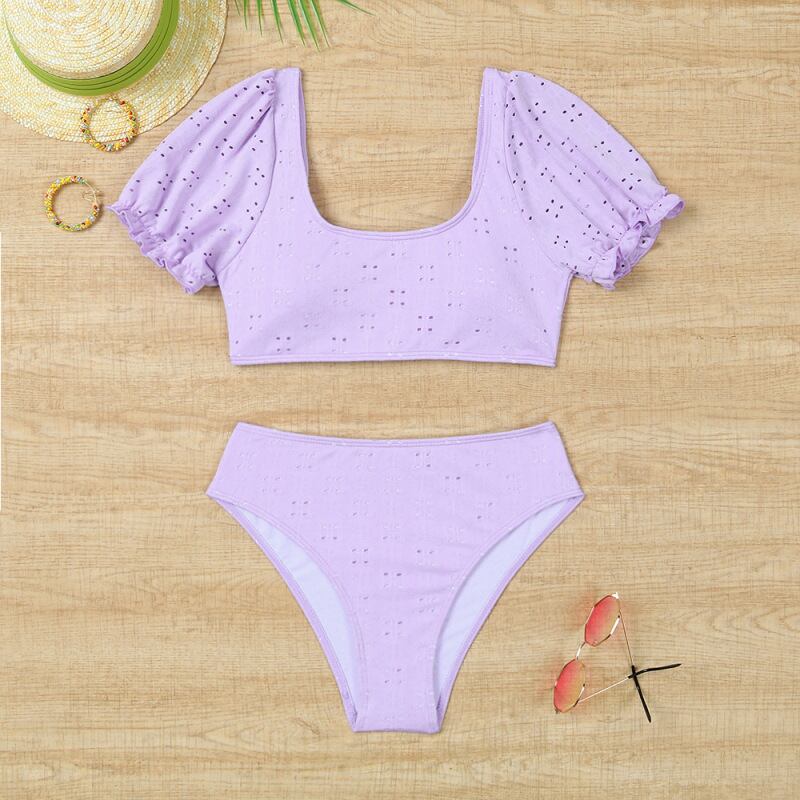 ラベンダーカラー、お袖のふんわりとしたデザインがとてもかわいい水着です