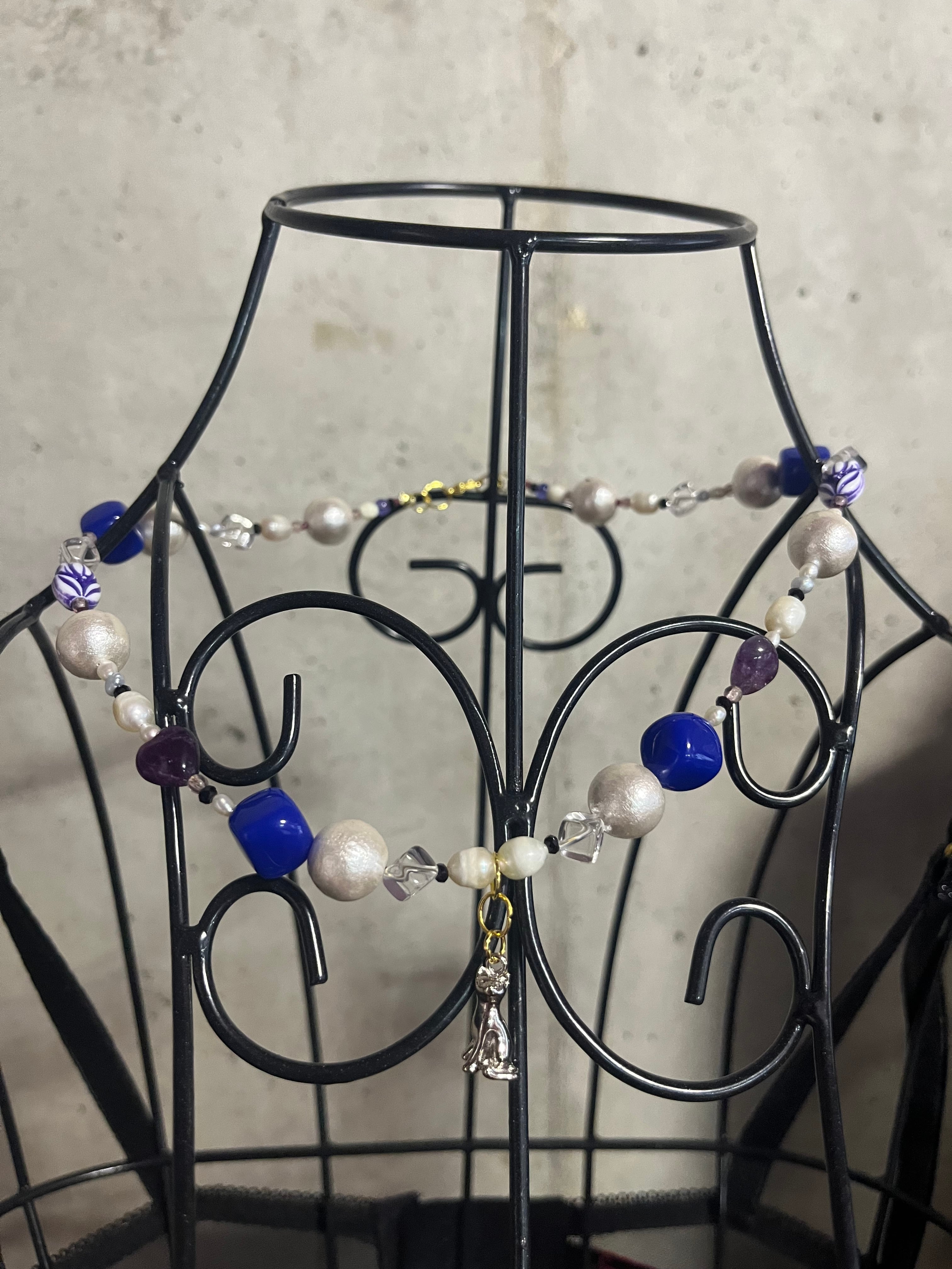 お座りをした上品な猫のチャームをメインに、優雅で落ち着いた女性をイメージしてお作りしました